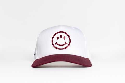 Elevate your style and embrace the extraordinary with our limited release Two-Toned Supernormal Snapback Hat in white and maroon, featuring the iconic smiley face logo embroidered on the front and smaller logo on the side, ensuring a comfortable and customizable fit with its adjustable snapback closure.